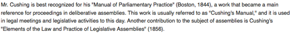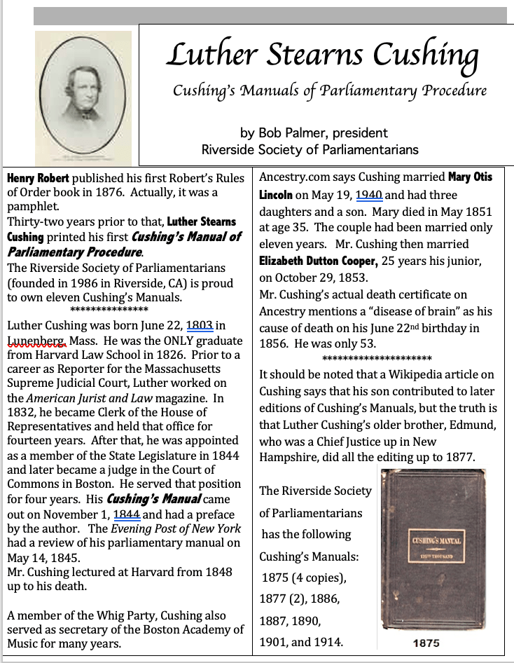 Luther Stearns Cushing (1803-1853) published his parliamentary procedure guide in 1844 thirty-two years before Henry M. Robert published his first Roberts Rules of Order.