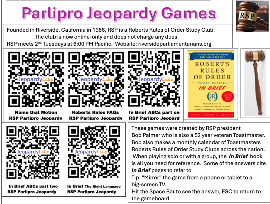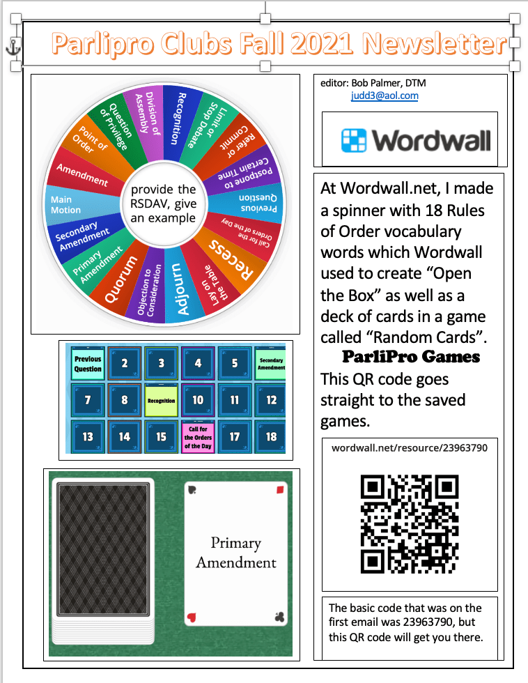 The QR code on the newsletter below takes you to all three games shown there. The R-S-D-A-V acronym in the center of the wheel is related to any Motions Chart. Do you need to be Recognized? Does your motion require a Second? Is your motion Debatable? Is it Amendable? What is the Vote needed for passage? R-S-D-A-V!