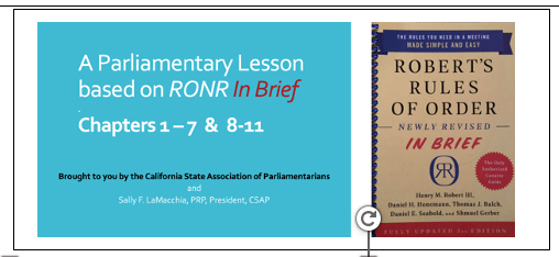 Just copy and paste this long URL into your browser to get to a 53-slide comprehensive review of the BASICS of PARLIPRO courtesy of the California State Association of Parliamentarians (CSAP).