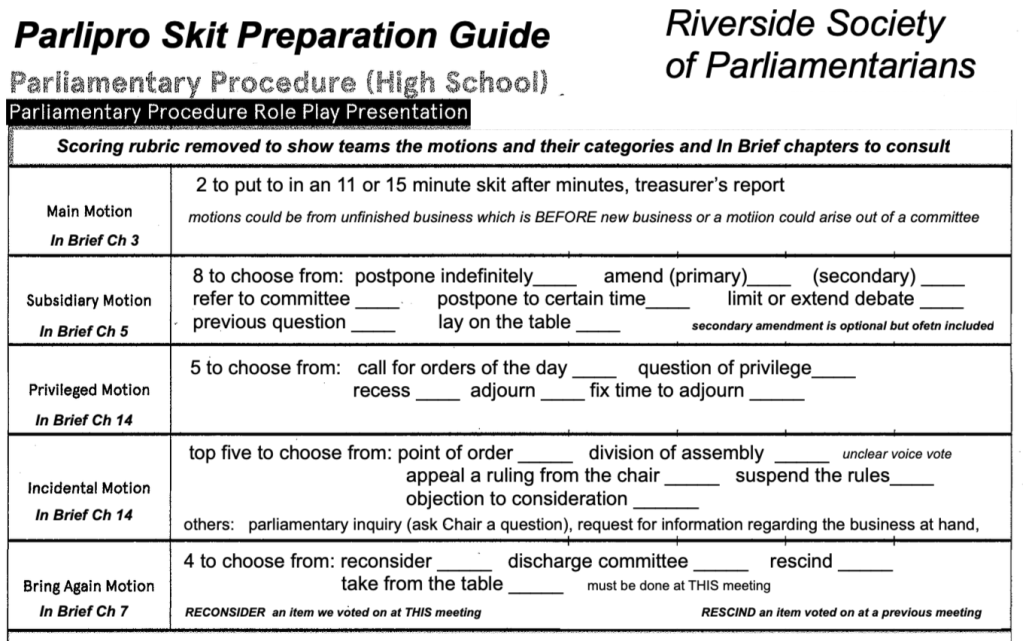 This Cheat Sheet for high school Parlipro Teams from FCCLA and FBLA is designed so they can create their 15-minute mock meetings which must include Main, Subsidiary, Privileged, and Incidental motions!